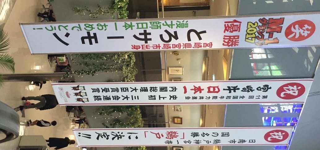 宮崎空港に掲示されたとろサーモンのM-1優勝を祝う懸垂幕